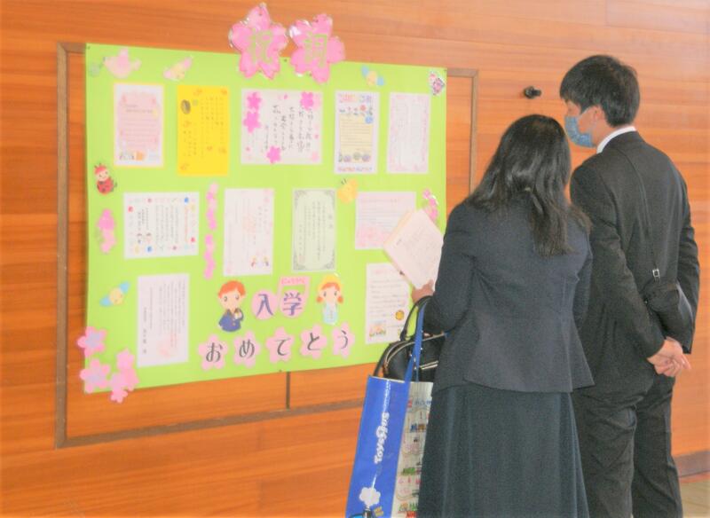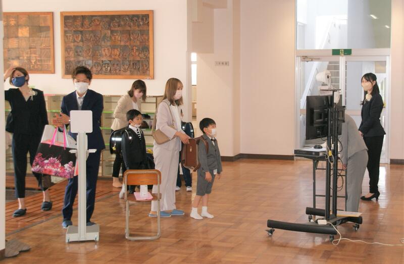 入学式その②です。いよいよ、1年生が入場します。通路で待っているときの子どもたちの真剣な表情から緊張感が伝わってきます。また在校生はオンラインで教室から参加しました。体育館の大型モニターに映し出された教室の様子から全校児童が歓迎していることが伝わってきました。(^_-)-☆
