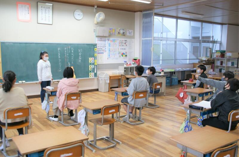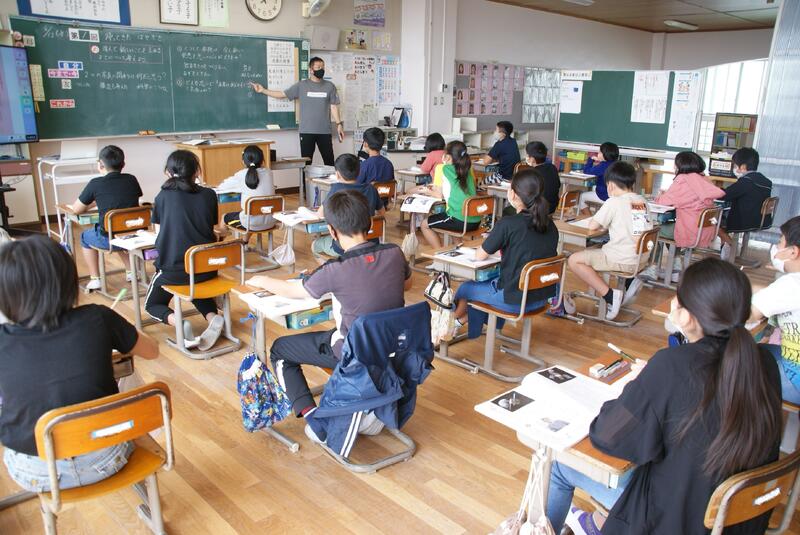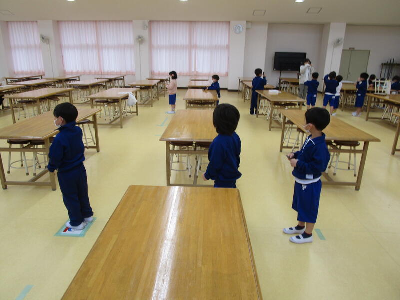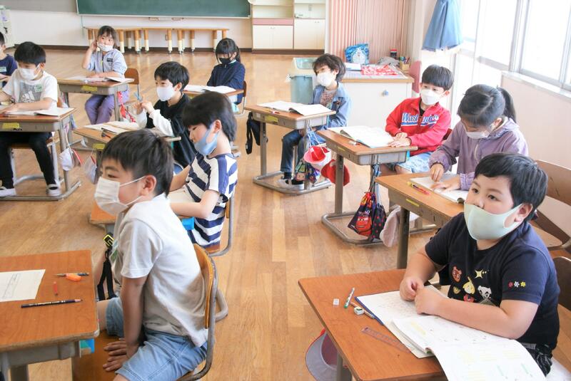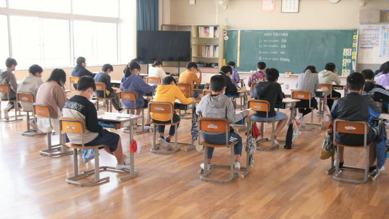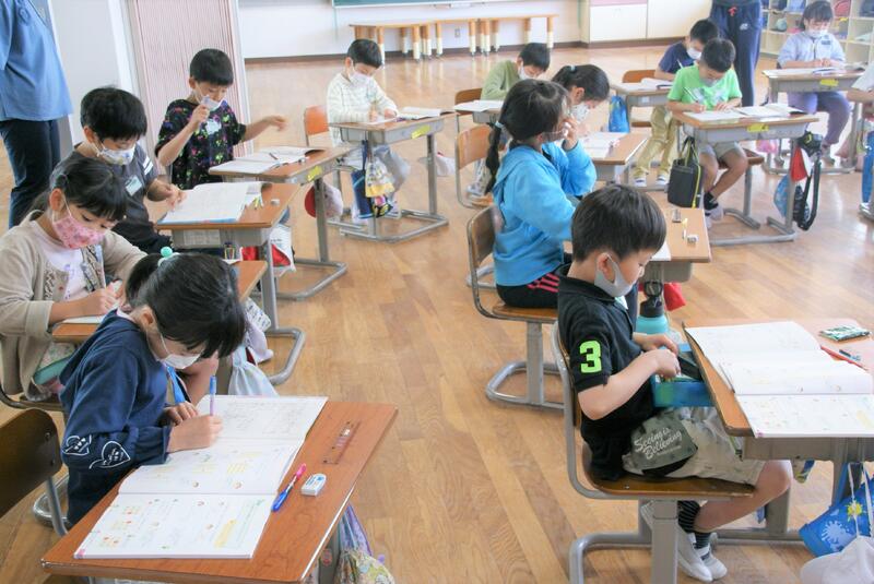 2年生です。体育と国語の時間の様子です。国語は単元のまとめとしてテストを行っていました。広いスペースを有効に使ってソーシャルディスタンスを実践できます。