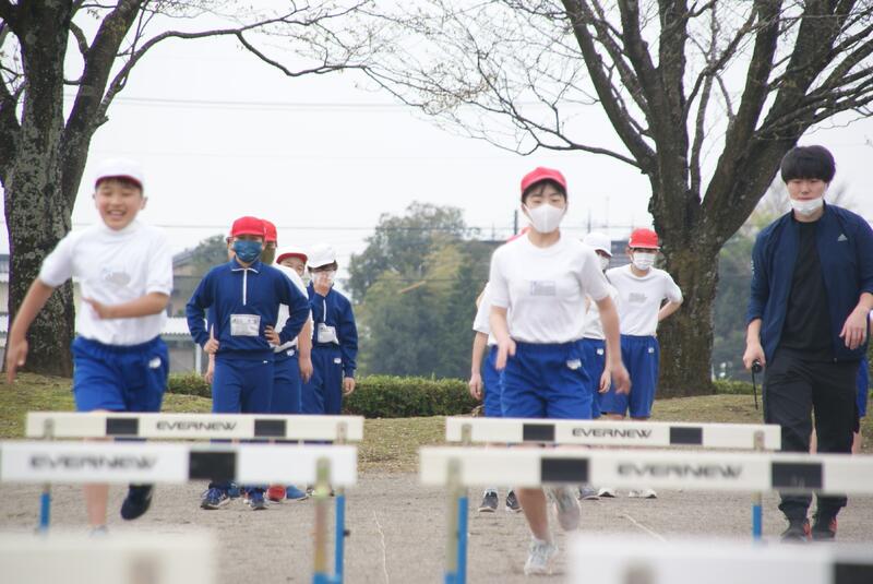 最初に準備運動を行うのはもちろんですが、主運動(ハードル走)の前に筋力、持久力、俊敏性等を高める目的でサーキット走を取り入れています。息を切らせながらも、走破タイムの短縮を目指してチャレンジしています。
