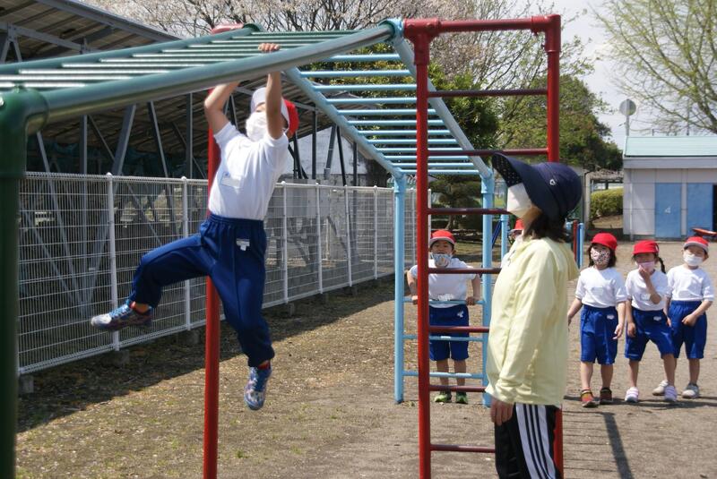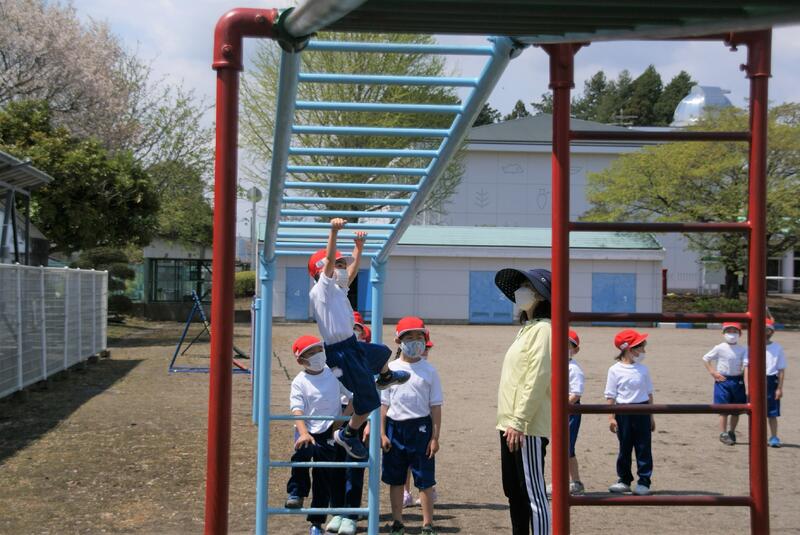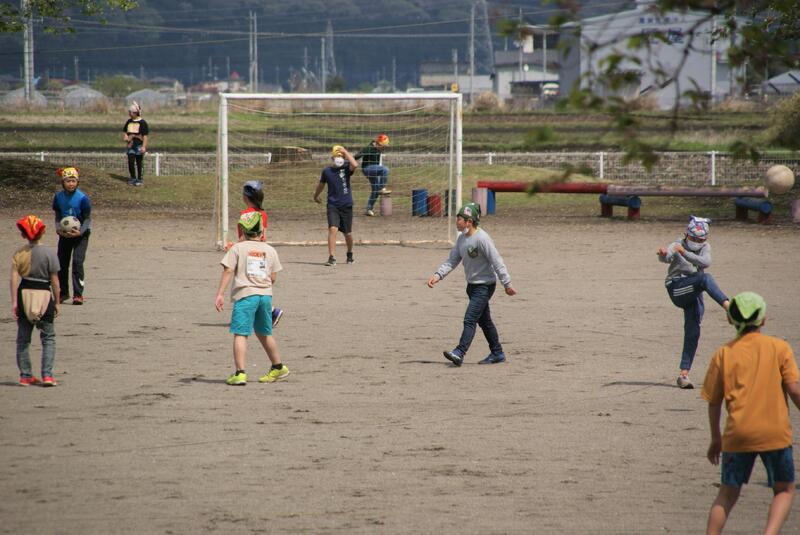 1年生の体育「たのしく あそぼう」の授業の様子です。今日は青空と太陽と新緑がとても気持ちいいです。校庭では、元気な1年生が鬼ごっこをして体を動かしていました。休憩するときやマスクを外すときは、ソーシャルディスタンスやしゃべらないなど、新型コロナウイルス感染症の感染対策もバッチリです。