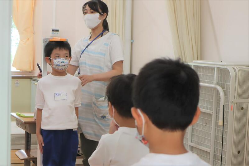 子どもたちが自分の成長に気付き、自分の健康状態について関心をもつようにすることを目的に、夏休み明け身体計測を実施しました。写真は1年生の身体計測の様子です。夏休み明け・・・1年生もすっかりお兄さん、お姉さんになりました。ソーシャルディスタンスを保ちながら、静かに待ち、計測することができました。立派な態度です。いい姿勢ですね(^_-)-☆