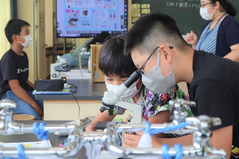 5年生の理科「花から実へ」の授業の様子です。この時間のめあては、「けんび鏡の使い方を知り、花粉を観察しよう。」です。けんび鏡の正しい操作方法を確認し、実際に花粉を確認していました。