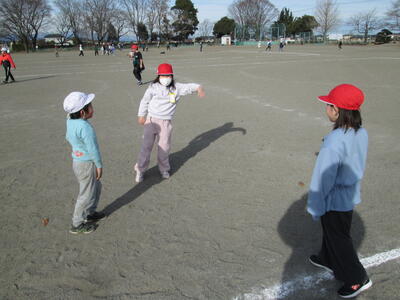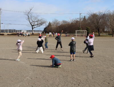 ↓この班は「だるまさんが転んだ」で遊んでいましたが、「だるまさんが〇〇した」と言ったら、その通りの動きをするルールにしていました。「だるまさんがダンスした」と言ったらみんなダンス、「だるまさんがテニスした」と言ったらみんながラケットを振る、そして「だるまさんが転んだ」と言ったらみんなその場でゴロリン…見ている方も楽しくなりました。子どもは遊びの天才ですね。