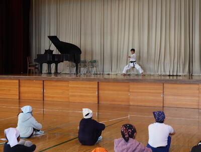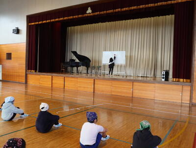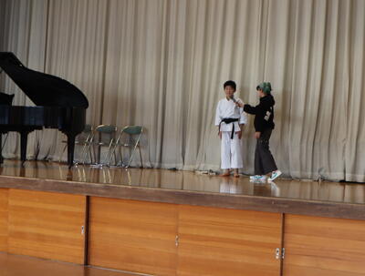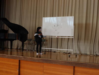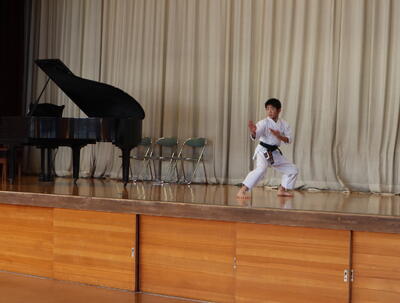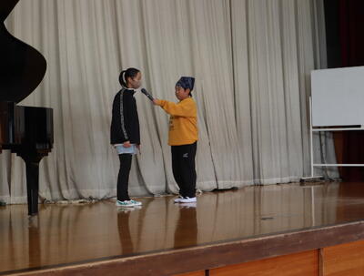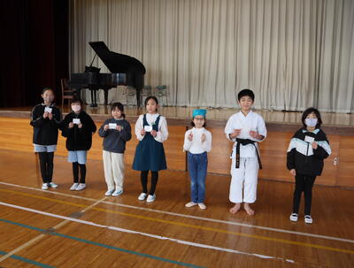 この「まつスタ」は、児童会(1学期代表委員さん)主催によるイベントで、希望者が特技などをみんなの前で披露する発表会です。今回応募した人は、総勢9組(12名)。2日目の24日は、「体育館の部」で、5組(7名)の子どもたちと大人1組(1名)が出場し、特技を披露しました。