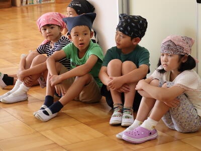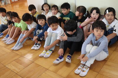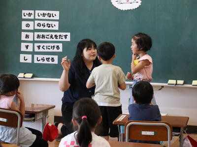 授業の終わりは決めの「敬礼」を教えていただきました。みんなかっこよく「敬礼」ができましたね。それから、警備会社のお姉さんからは「宿題」もでましたね。みんなおうちに帰って「宿題」はできたかな?(「宿題」は、今日習った「いか・の・お・す・し」をおうちの人にお話しすることでした。)