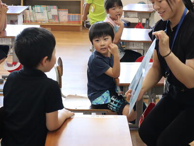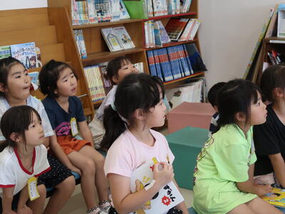 図書室では、図書の先生が読み聞かせ。カツ丼になりたくない!と飛び出したとんかつ君。いろいろな出会いがあったけど結局カツ丼に戻りました…楽しいお話でしたね。