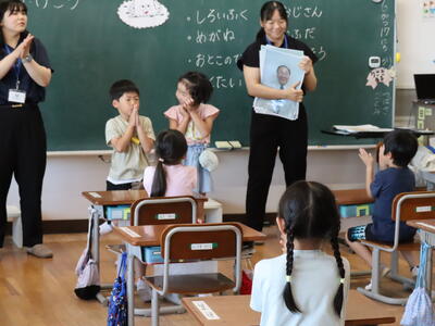 17日(火)、1年生の「あんしん教室」が開かれました。「いか・の・お・す・し」をもとに、警備会社の方に不審者から身を守る授業をしていただきました。「いか・の・お・す・し」はご存じのとおり、「(ついて)いかない・のらない・おおごえを出す・すぐにげる・しらせる」という、不審者から身を守る合い言葉です。一つ一つ、クイズや実際に練習もしながら、いざというときのための訓練を行いました。