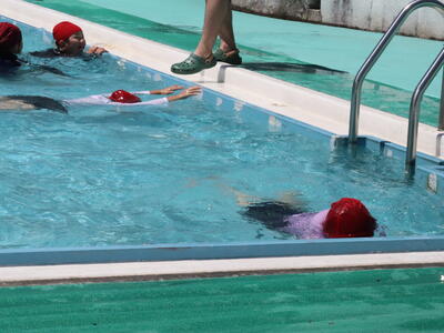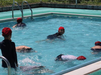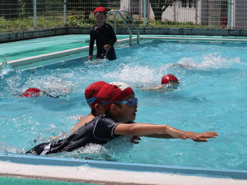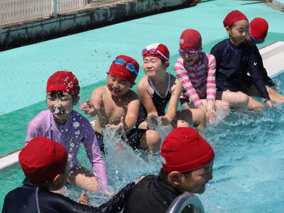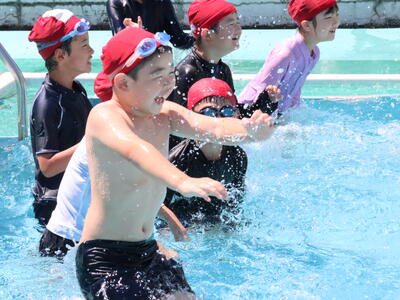 低学年では、水に慣れる・親しむことを目的に、水の中を移動する運動遊びや、もぐる・浮く運動遊びを行います。いずれも、楽しく運動することが大切です。2年生はプール活動2年目ですので心得もよく分かっていて先生との息もぴったりです。お隣同士で水をかけ合ったり、定番の「流れるプール」をつくってみたり。移動する遊びでは、しゃがんで歩く「アヒルさん」、しゃがんで横歩きの「カニさん」それから体育座りになってそのまま浮く「ダンゴムシ」など、いろいろな生き物になって楽しんでいました。