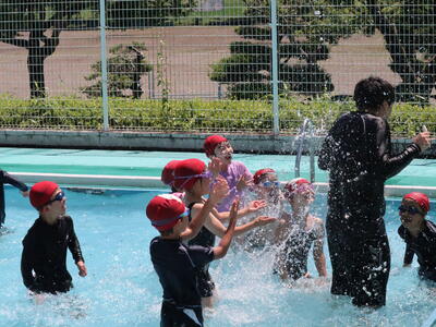 友だち同士で「見ててね」と技を見せ合ったり、「先生!やってみるから見てください!」と知らせてくれたり。先生にも水かけ攻撃!とても楽しそうに活動している様子が見られ、(暑い日でしたが)心がさらにあたたかくなりました。