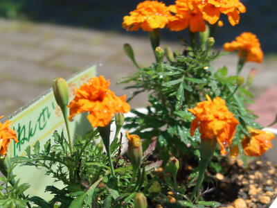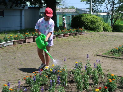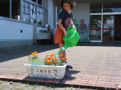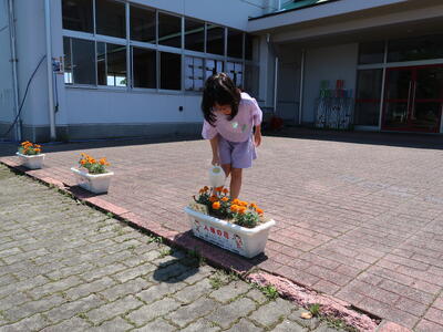 昇降口前の人権の花に水やりです。大きく元気に育ってます。ありがとう。