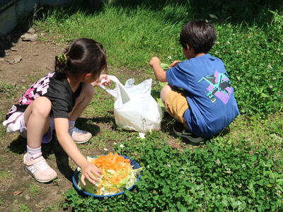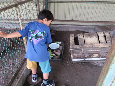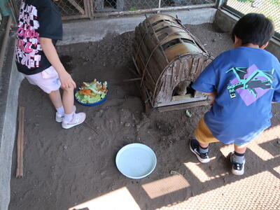 ウサギさんにえさをあげる当番さんです。2羽のウサギ(ココアとマロン)喜んでましたね。