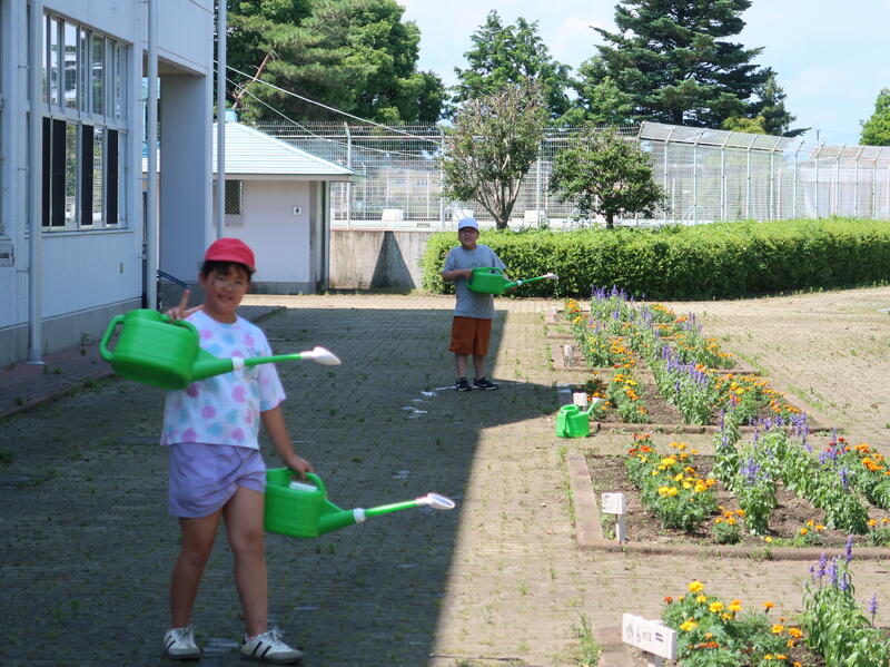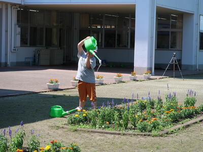 緑化飼育委員会の子どもたちが花壇の花に水をあげます。特にサルビアが暑さでしょんぼりしていましたが、きっと元気を取り戻すでしょう。ありがとう。