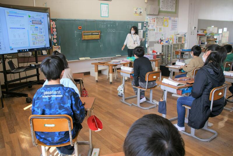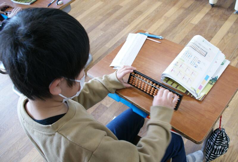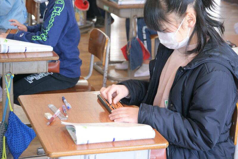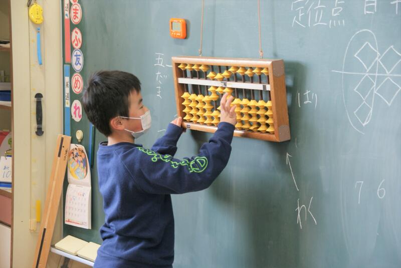 そろばんによる数の表し方について理解するとともに、そろばんを用いて簡単な加法及び減法の計算ができるようにする学習です。黒板に掲げた大型の「そろばん」で説明を受け、手元に置いた「そろばん」で実際に操作しています。