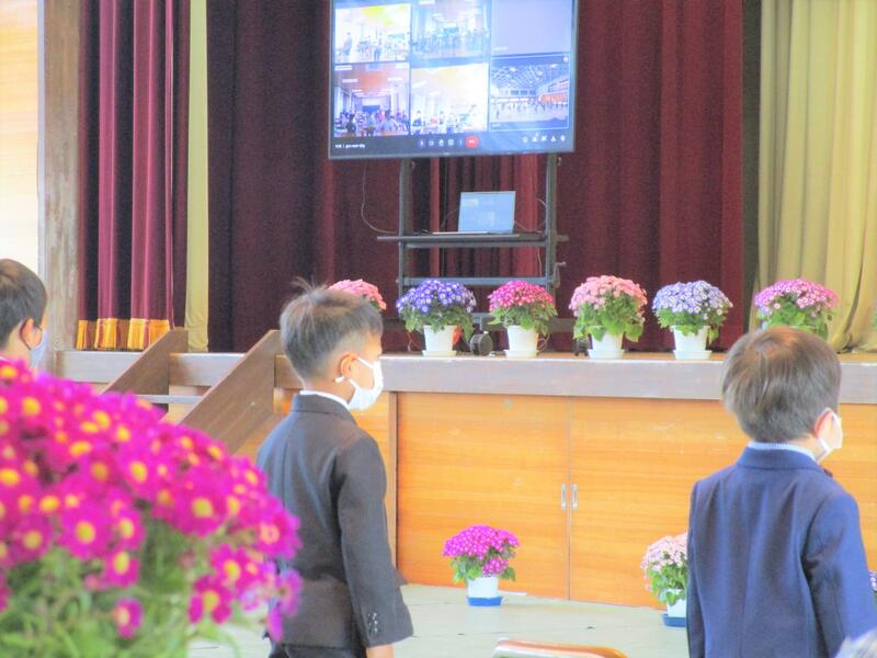 入学式その②です。いよいよ、1年生が入場します。通路で待っているときの子どもたちの真剣な表情から緊張感が伝わってきます。また在校生はオンラインで教室から参加しました。体育館の大型モニターに映し出された教室の様子から全校児童が歓迎していることが伝わってきました。(^_-)-☆