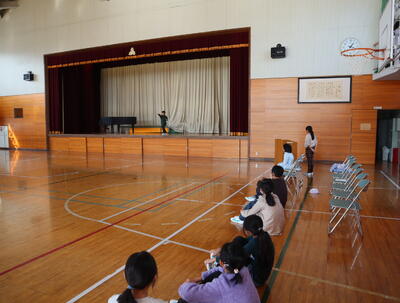 この「まつスタ」は、児童会(1学期代表委員さん)主催によるイベントで、希望者が特技などをみんなの前で披露する発表会です。今回応募した人は、総勢9組(12名)。内容は当日のお楽しみです。当初は、18日から3回にわたって行う予定でしたが、学級休業等があったため、冬休み直前の23日(屋外の部)と24日(体育館の部)のお昼休みに行うことにしました。