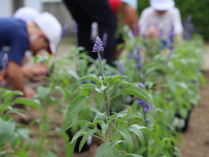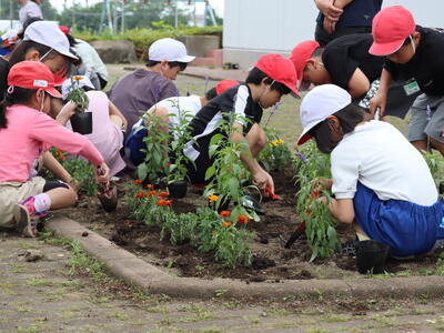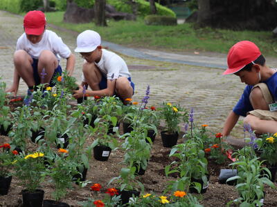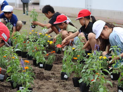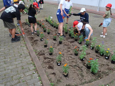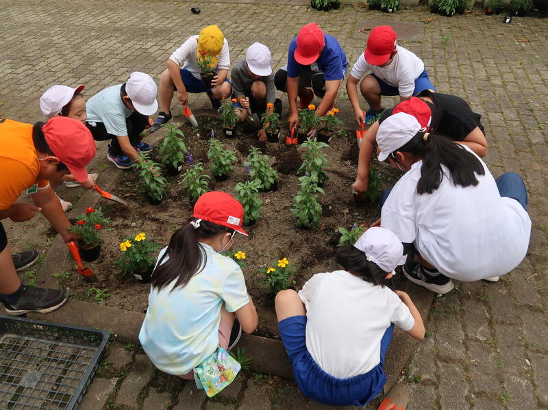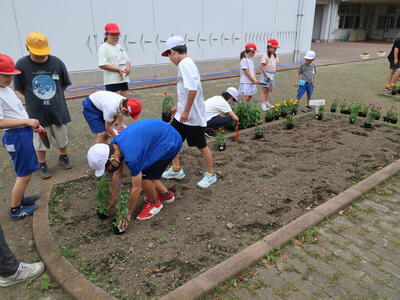 まつのみ班(縦割り班)ごとの活動です。5・6年生が中心になって、赤、オレンジ、黄色のマリーゴールドと青いサルビア(ブルーサルビア)をレイアウトを考えて並べ、一斉に植えました。レイアウトを考えるのもけっこうたいへんです。色のバランスや、苗同士の間隔や苗の配置など、感性が試されます!「サルビアは背が高いから、真ん中に植えよう」「同じ色が続かないように色を変えて…」などと、話し合っていた班もありました。班ごとにレイアウトもさまざまで個性が出ます。レイアウトが決まったら一斉に植えていきます。1年生にとっては、はじめての苗植えでしたが、上級生が手伝ったり優しく声をかけたりしながら、一生懸命に植える姿が見られました。 早く終わった班はプランターの苗植えも行いました。