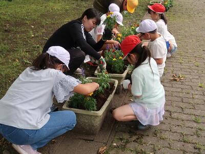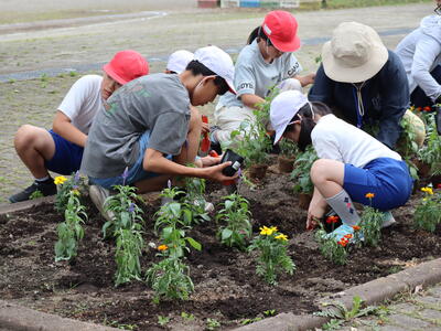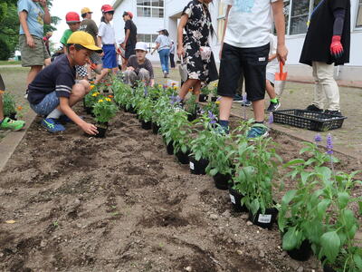 ※活動終了後は昼休みになりましたが、高学年の児童が、体育館通路の花壇やプランターへの苗植えを手伝ってくれました。いろいろおしゃべりをしながら作業をしていて、とても楽しくうれしく心あたたかくなるひとときでした。お手伝い、ありがとう。