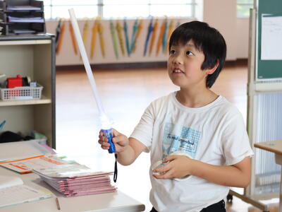 ※下の2枚目の児童は、石油ポンプとLEDライトで、映画「スターウォーズ」に出てくるライトセーバーをつくりました。すごい!