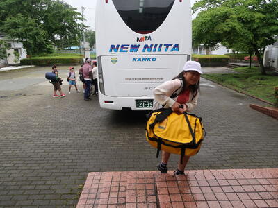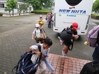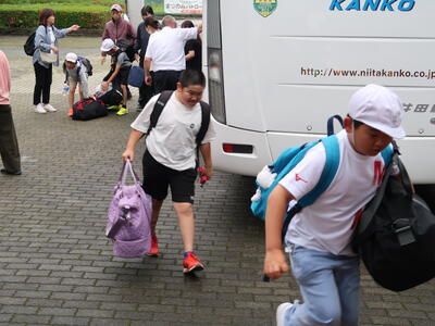 出発式、そして保護者のみなさんに「行ってきます」のあいさつのあと、バスに乗り込み、さきほど出発しました。