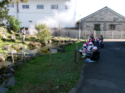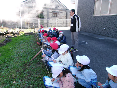 国語科「しらせたいな、見せたいな」の授業です。学校にいる生きものや学校で見つけたものを文章で家の人に伝えるため、池の鯉の観察をしました。