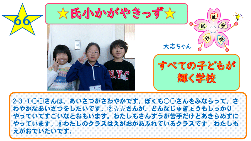 「氏小かがやきっず」は、すべての学級すべての児童を対象にローテーションで実践しています。私たちは、自分を肯定できる児童、互いに認め合って生きる児童を育てたいと考えています。児童のコメントは校内放送で紹介され、各学年の廊下にも掲示しています。