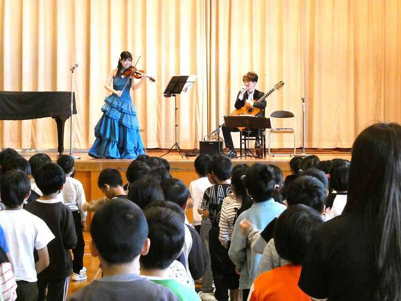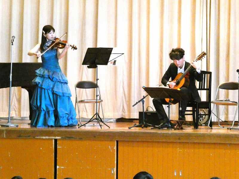 本日の2・3時間目にヴァイオリン奏者の渡邉弘子さんとギター奏者の渡邉洋邦さんに御来校いただき、「音楽鑑賞会」を実施しました。