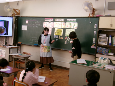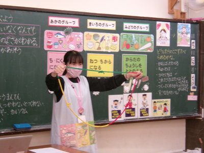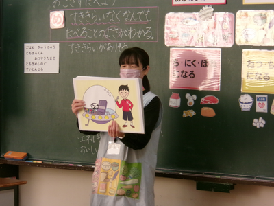 1年生の学級活動「残さず食べよう」です。給食が健康な体を作るためにいろいろな食品で作られていることを知り、好き嫌いなく食べることのよさについて学びました。