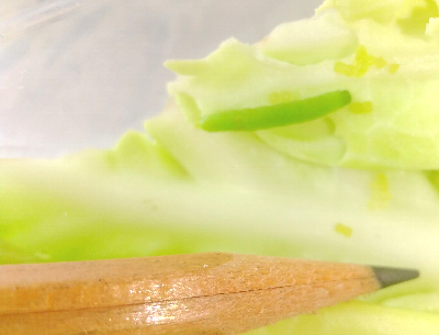 ピントがずれていてわかりづらいしゃしんですが、キャベツの下にうかんでいるように見えるのは、モンシロチョウのよう虫です。