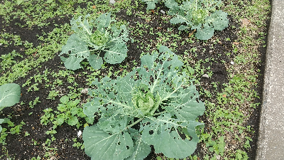 モンシロチョウのよう虫が食べたので、はがあなだらけになっていますね。