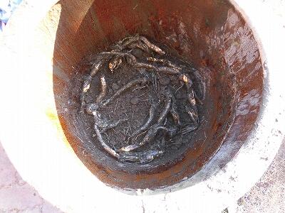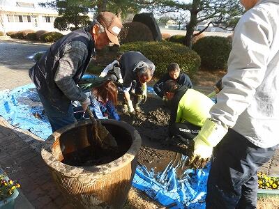 玄関脇に置いてあるハスの植え替え作業を行いました。
