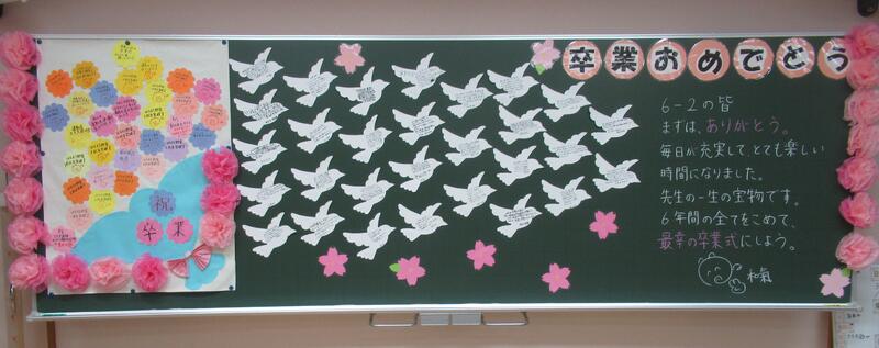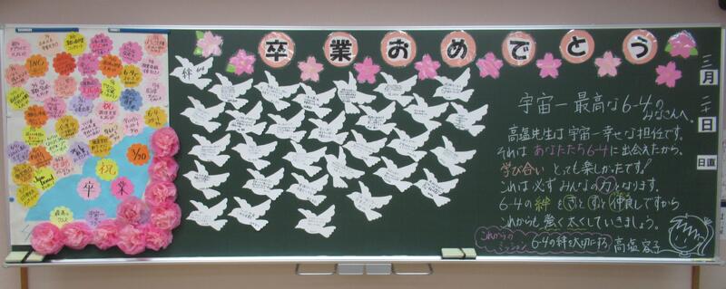 朝の6年教室の黒板です。卒業式を迎える一人一人の思いと担任からのメッセージがありました。