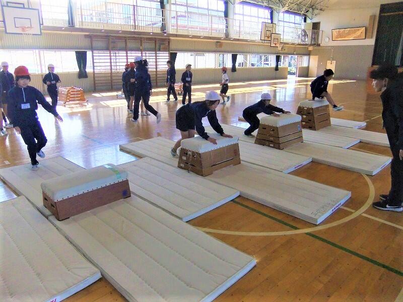 体育の跳び箱の授業です。閉脚跳びに取り組んでいます。様々な高さの跳び箱を用意してあり、子どもたちは、自分の挑戦したい高さを選んで練習していました。