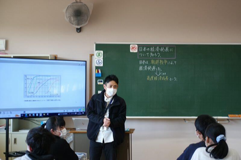 社会科の授業の様子です。「新しい日本、平和な日本へ」の学習で、高度経済成長期の日本について学習しています。経済の発展による国民生活の変化や、それに伴って発生した公害などの問題について知り、これらの歴史の学習を自分たちの未来に生かそうという意識を高めることができました。