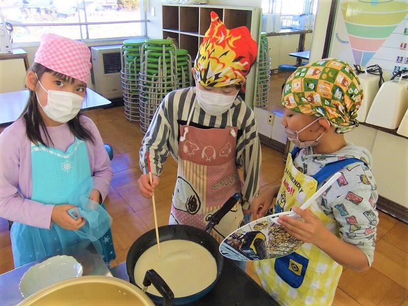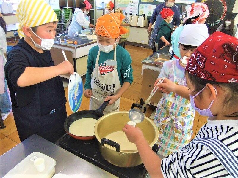子どもたちにとって、豆腐は、給食にもよく使われているなじみ深い食材ですが、作るのは初めてです。豆乳がどうやって豆腐になるのか、子どもたちは興味津々で、グループの友達と協力して、楽しく慎重に活動することができました。作った豆腐は持ち帰りましたので、家族で召し上がってください。
