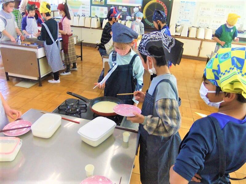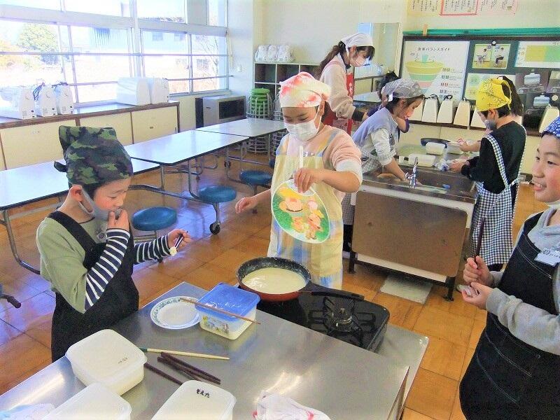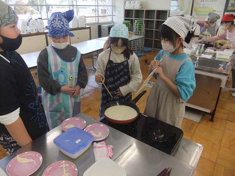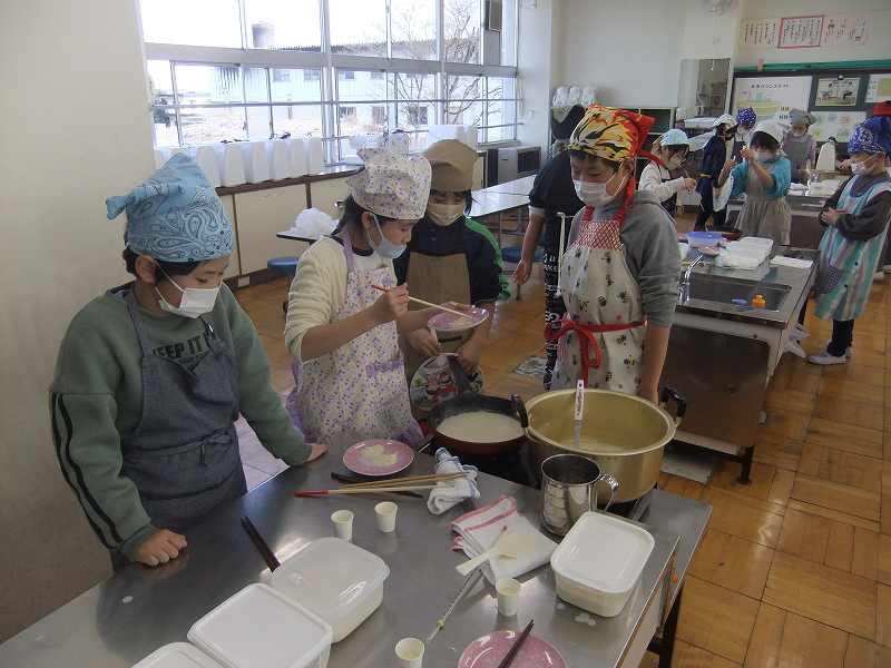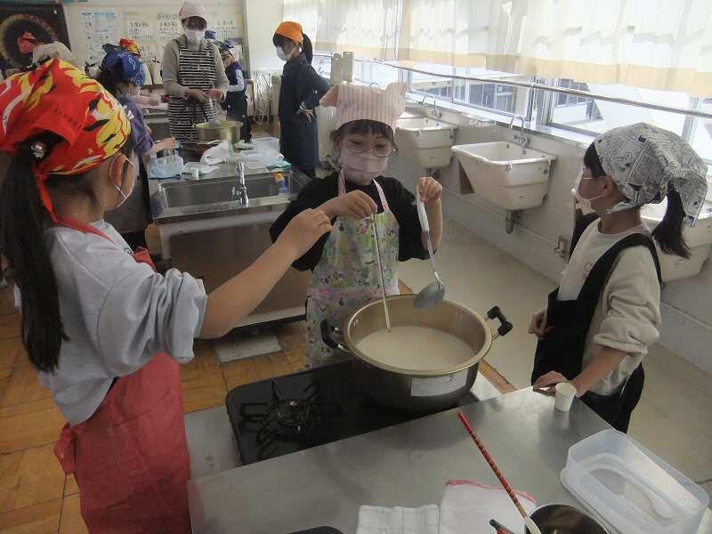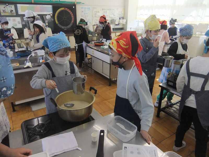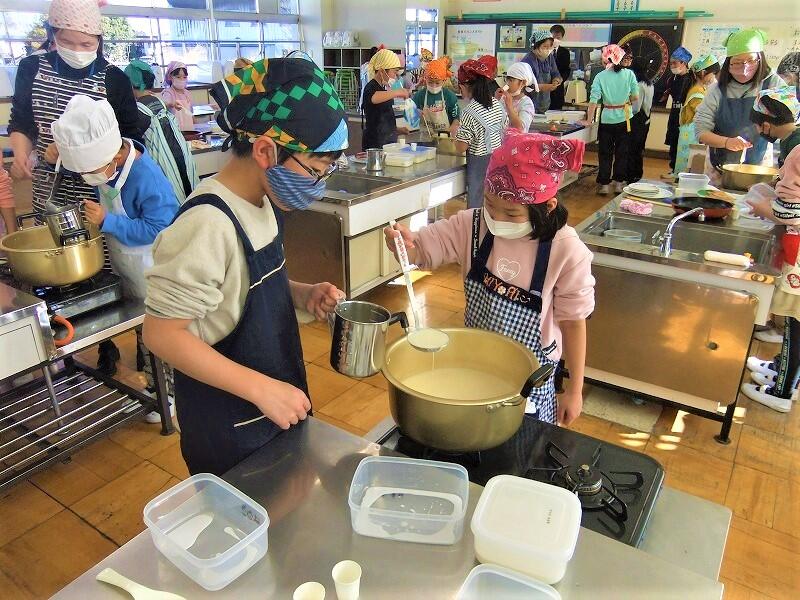 子どもたちは、総合的な学習の時間の活動で大豆について調べる過程で知ったことを生かしながら、友達と協力して豆腐づくりに取り組みました。湯葉も味見することができ、笑顔がたくさん見られました。作った豆腐は持ち帰りましたので、ご家族で召し上がってください。