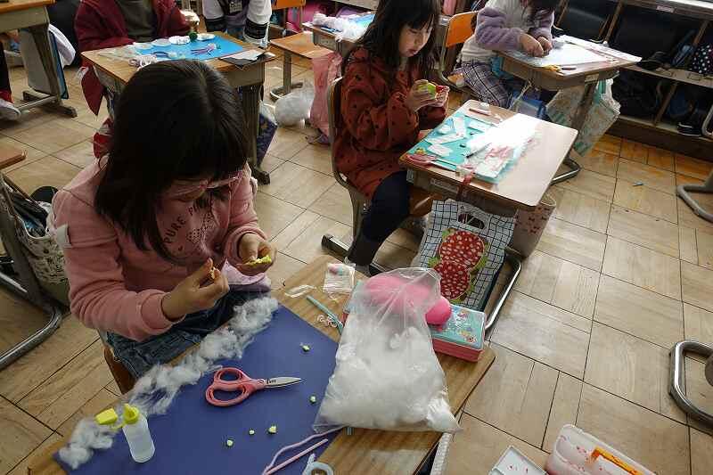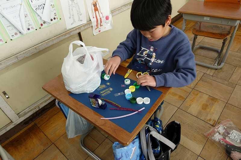 図画工作の授業の様子です。「材料からひらめき」の学習で、ペットボトルキャップや綿、毛糸など、身の回りにある材料を持ち寄り、画用紙に貼り付けて作品を作っています。子どもたちは、楽しみながら学習に取り組むことができました。