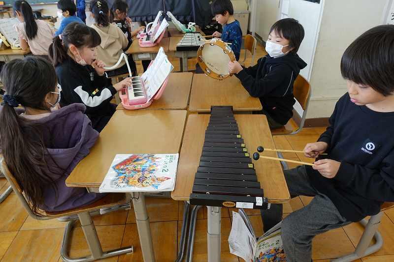 音楽の授業の様子です。「チャチャマンボ」の学習で、鍵盤ハーモニカや木琴・鉄琴などを使って演奏する練習をしています。子どもたちは、リズムを合わせながら楽しんで演奏することができました。
