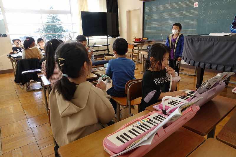 音楽の授業の様子です。「めざせ楽器名人」の学習で、鍵盤ハーモニカの演奏の練習をしています。演奏を楽しんだり、友達の弾く音楽を楽しんだりしながら、音楽に親しむことができました。