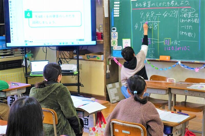 算数の「小数のかけ算とわり算を考えよう」の授業です。ここでは、小数÷整数の問題に取り組んでいます。