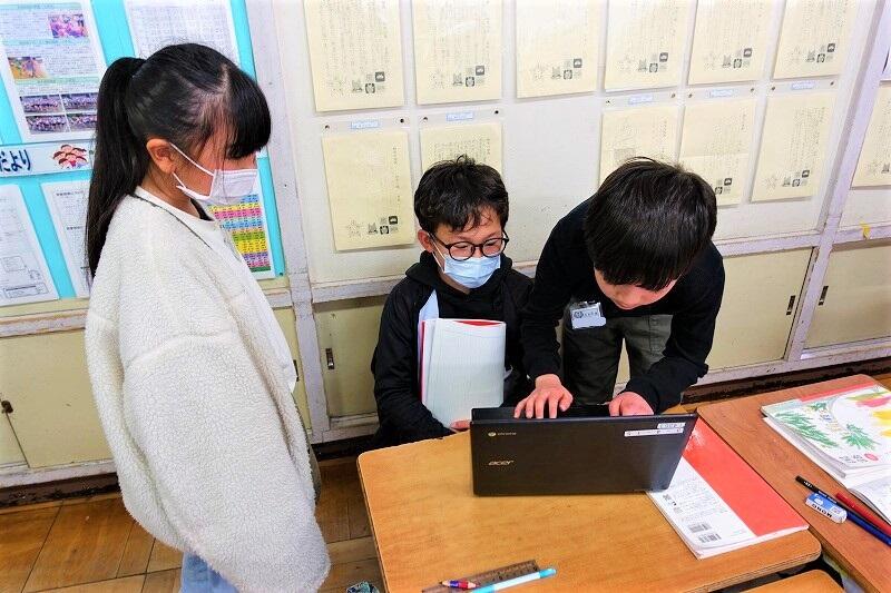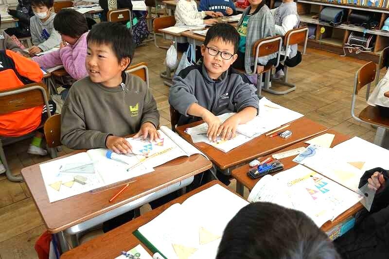 算数の授業です。「直方体と立方体」の学習を、プリントで振り返っています。子どもたちは、教科書を見直したり、友達と教え合ったりして学習を進めていました。