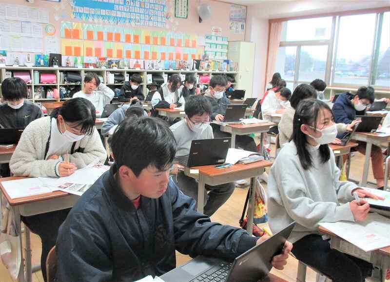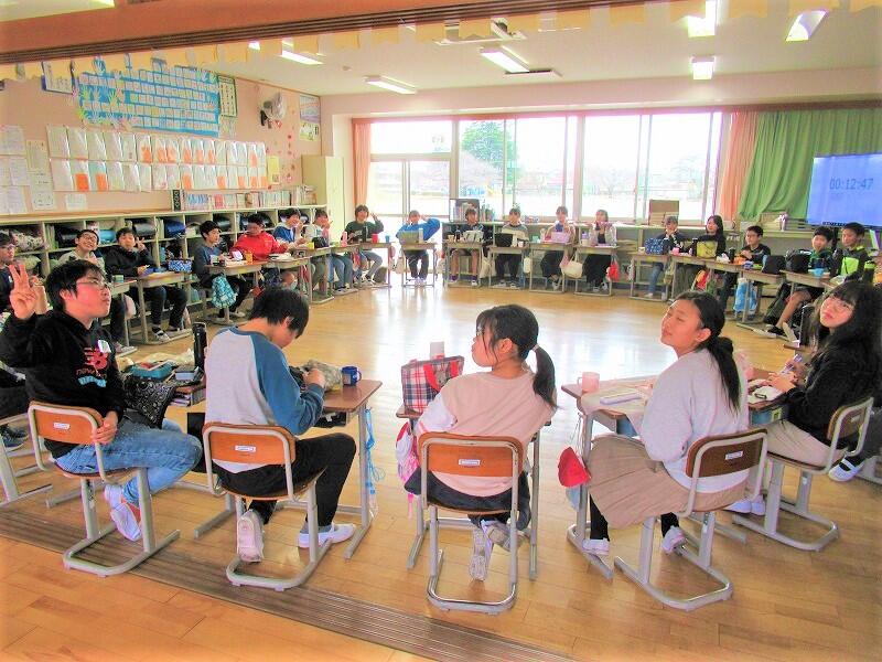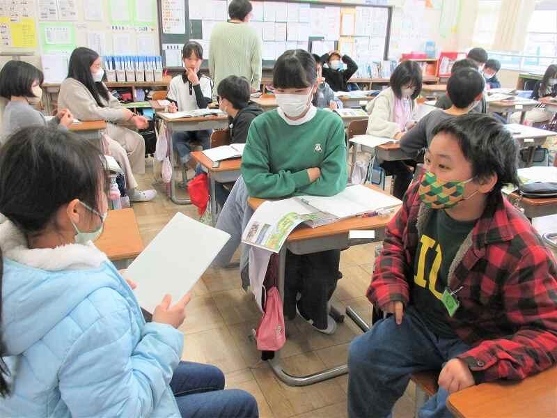 外国語(英語)の授業です。「クイズ大会をしよう」という活動です。グループごとに、教科書について「ここに書かれていたのは何でしょう」といった問題を作り、お互いに英語で出題し合いました。
