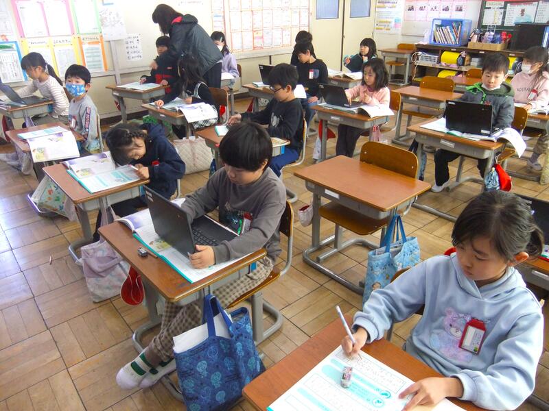 算数の授業です。「なんじなんぷん」の学習で、時計の図を見て、示された時刻は何時何分か正しく読み取ったり、時計の針を書き込んだりしています。子どもたちは、時計に関心をもち、そのよさや楽しさを感じながら学んでいます。