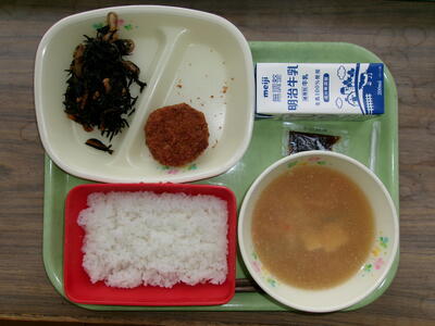 今日は、ひじきの炒め煮にしました。ひじきを油で炒めてから、味付けをして煮込んで作りました。みなさん、今日も残さずにいただきましょう。