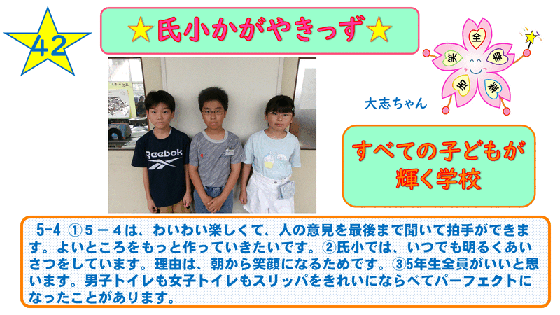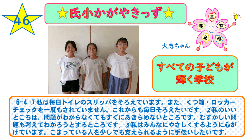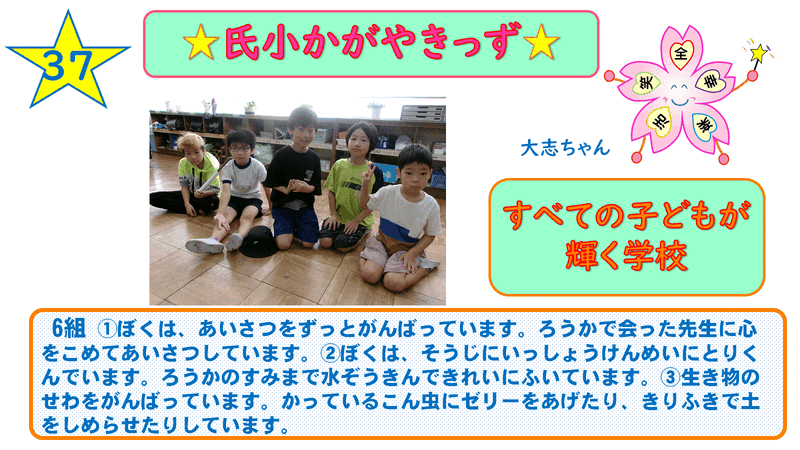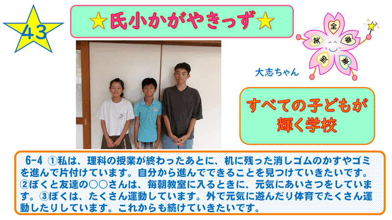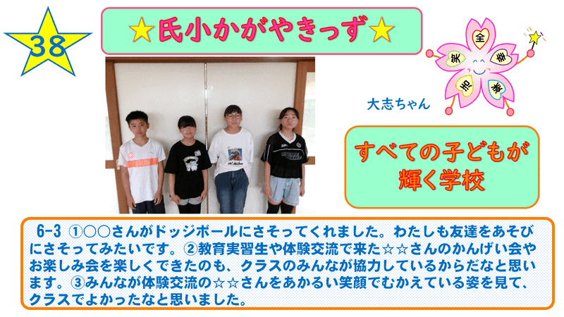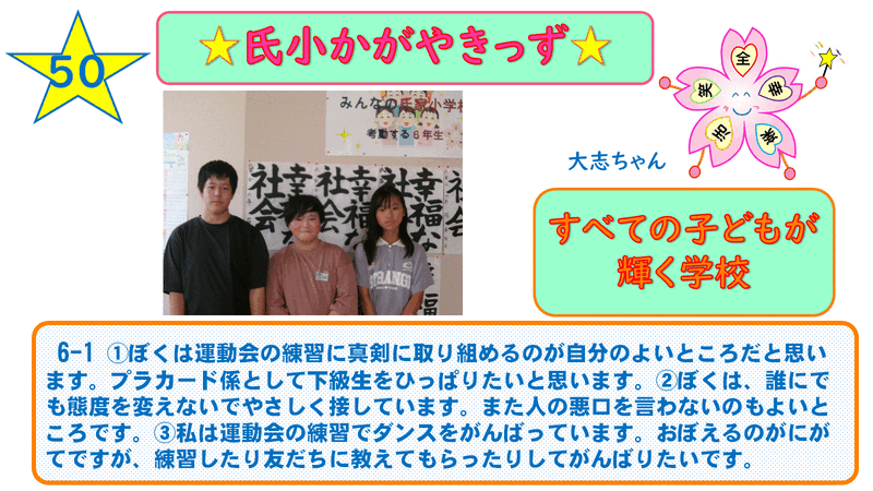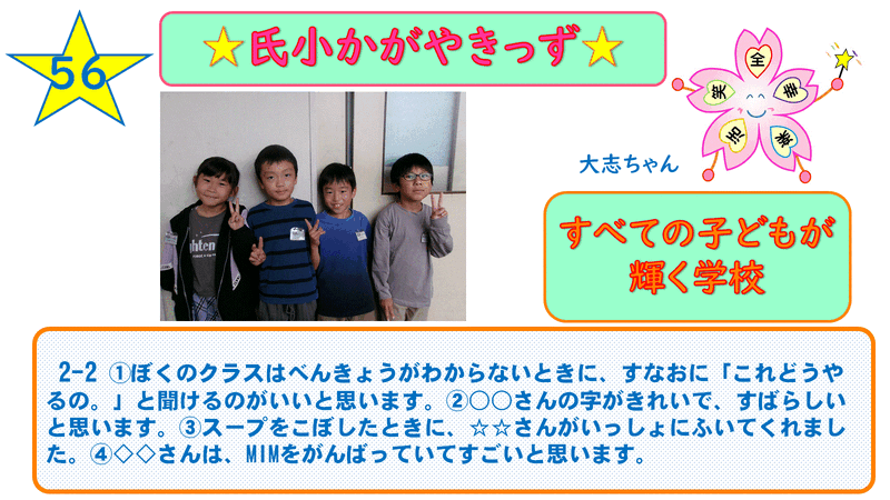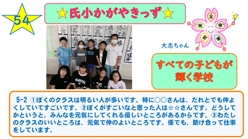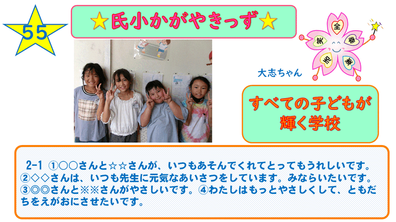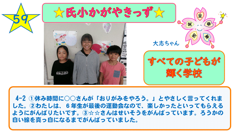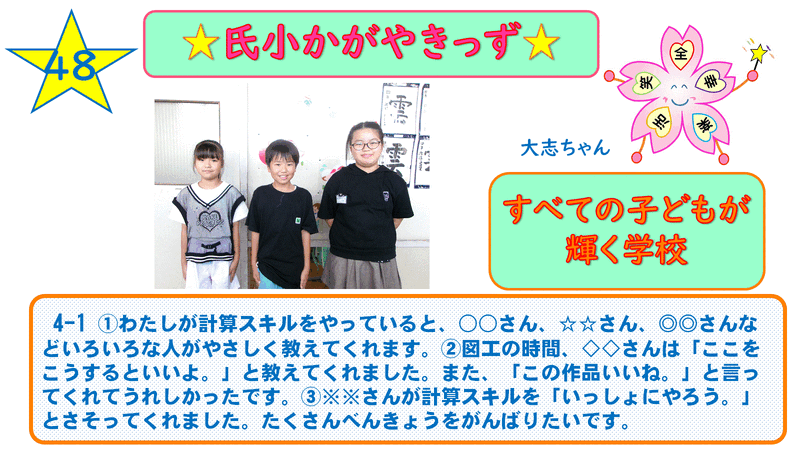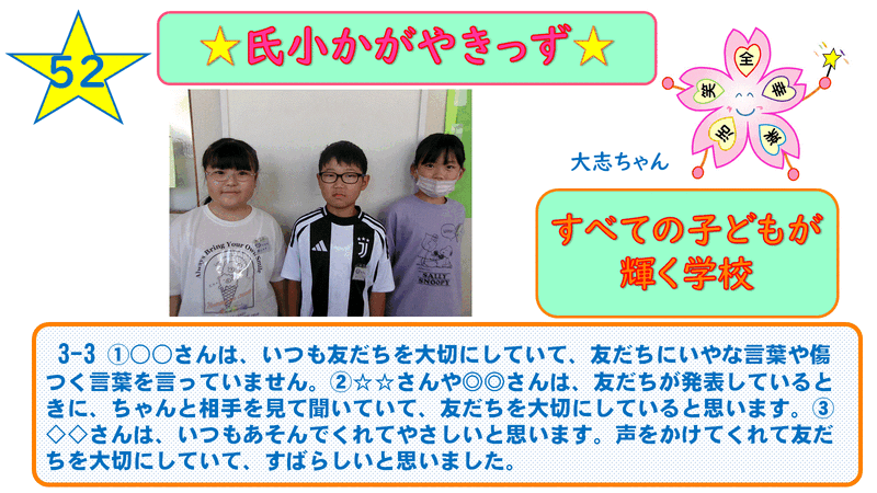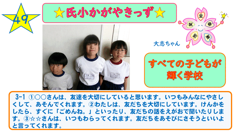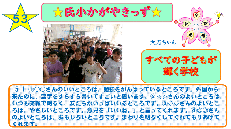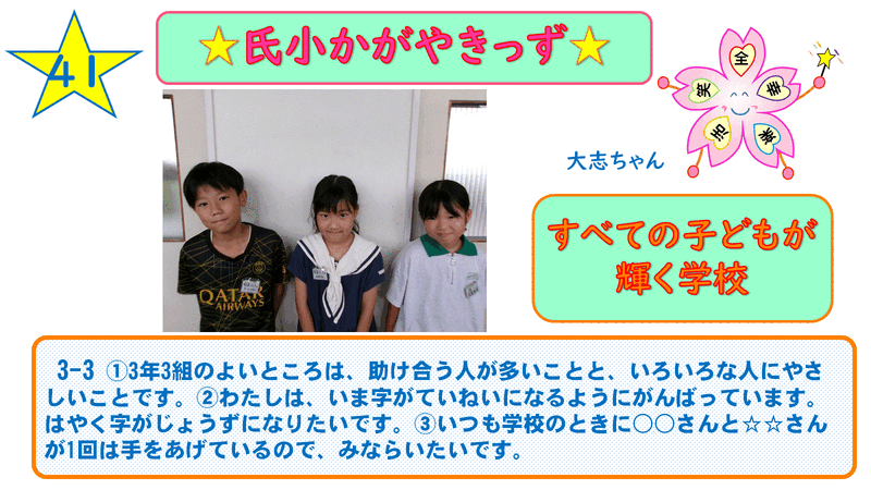 「氏小かがやきっず」は、すべての学級すべての児童を対象にローテーションで実践しています。私たちは、自分を肯定できる児童、互いに認め合って生きる児童を育てたいと考えています。児童のコメントは校内放送で紹介され、各学年の廊下にも掲示しています。