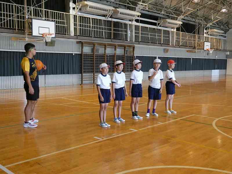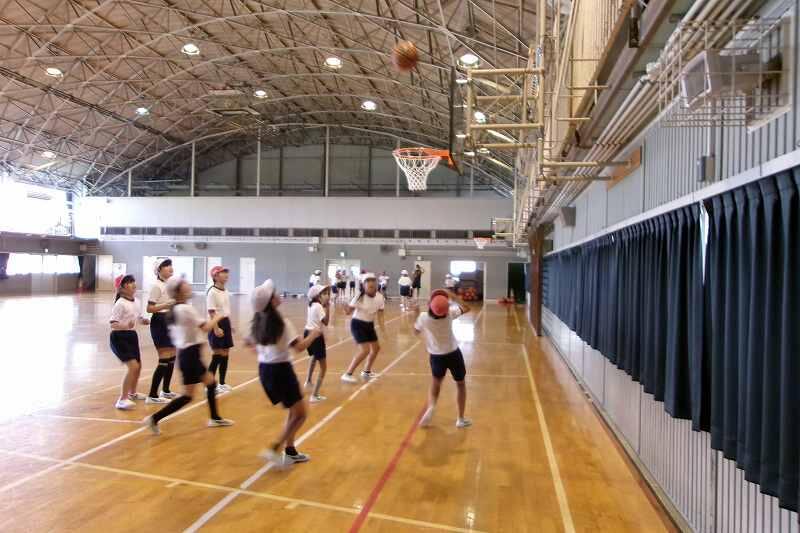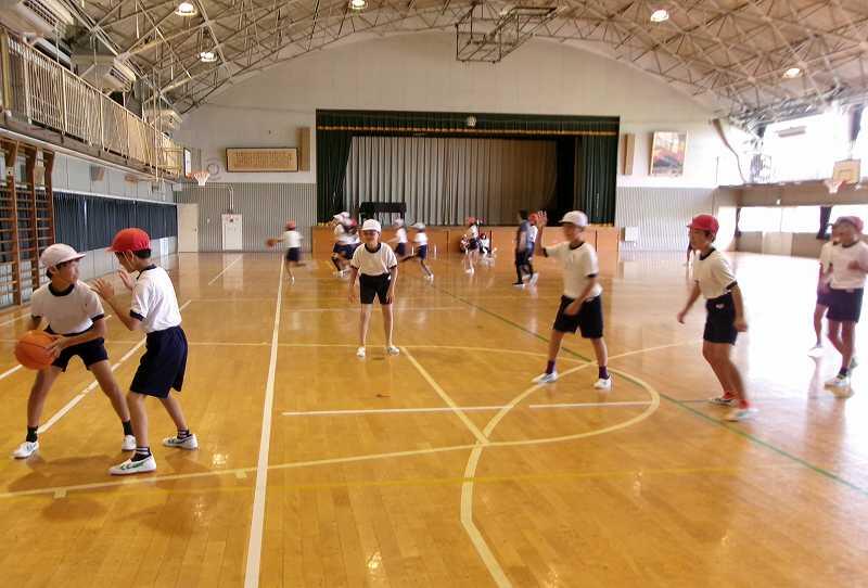 体育の授業の様子です。5年生の体育では「バスケットボール」の学習をしています。ルールをおぼえたり、チームごとに課題を決めて練習することで子どもたちは目標に向かって力を合わせて頑張っていくことも学んでいます。試合の際には、楽しみながら一生懸命活動していました。