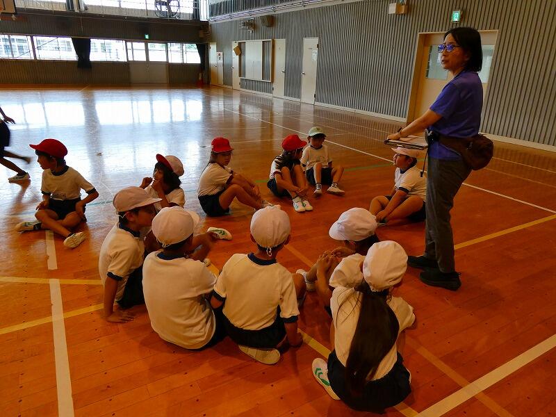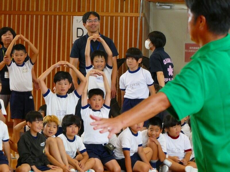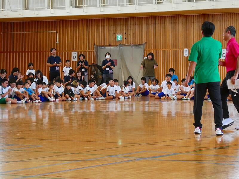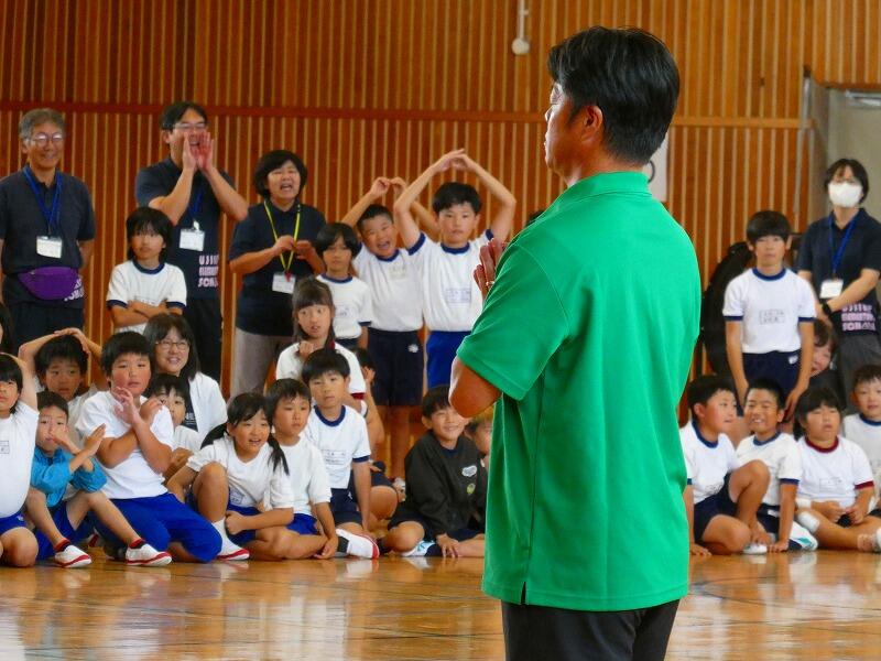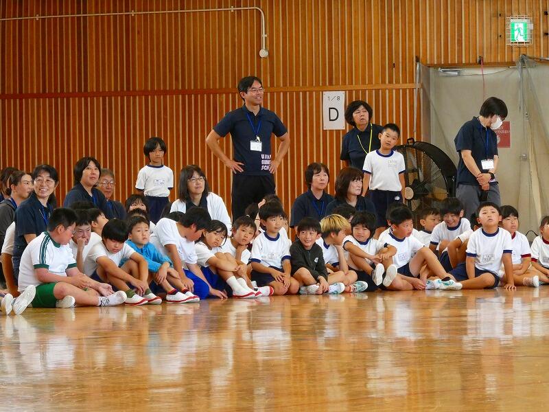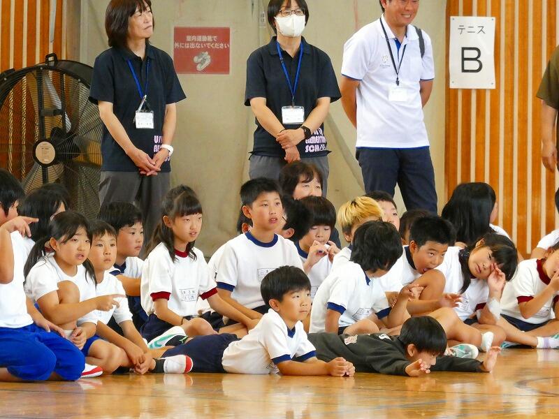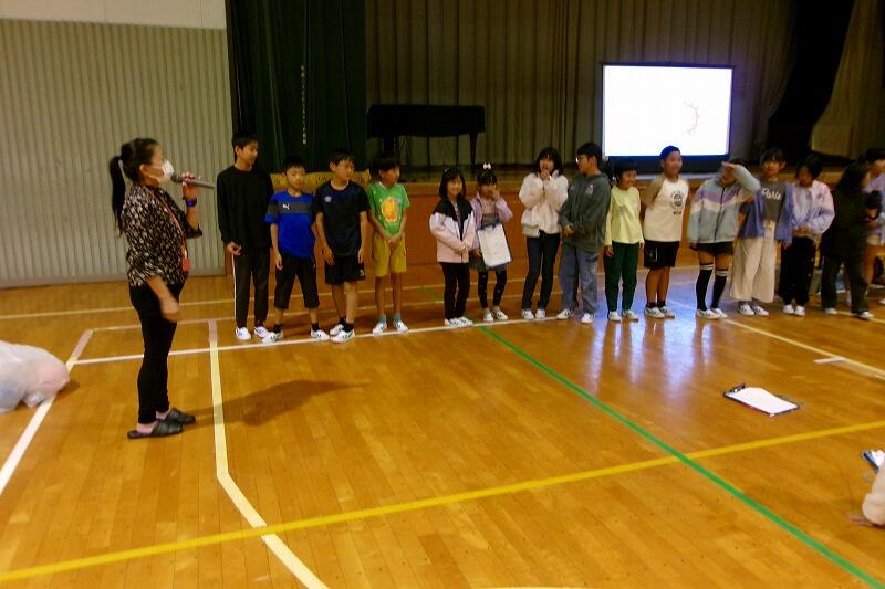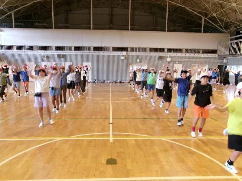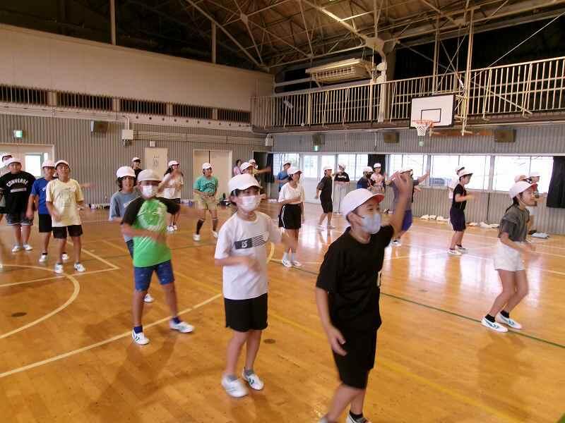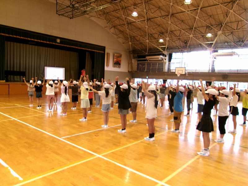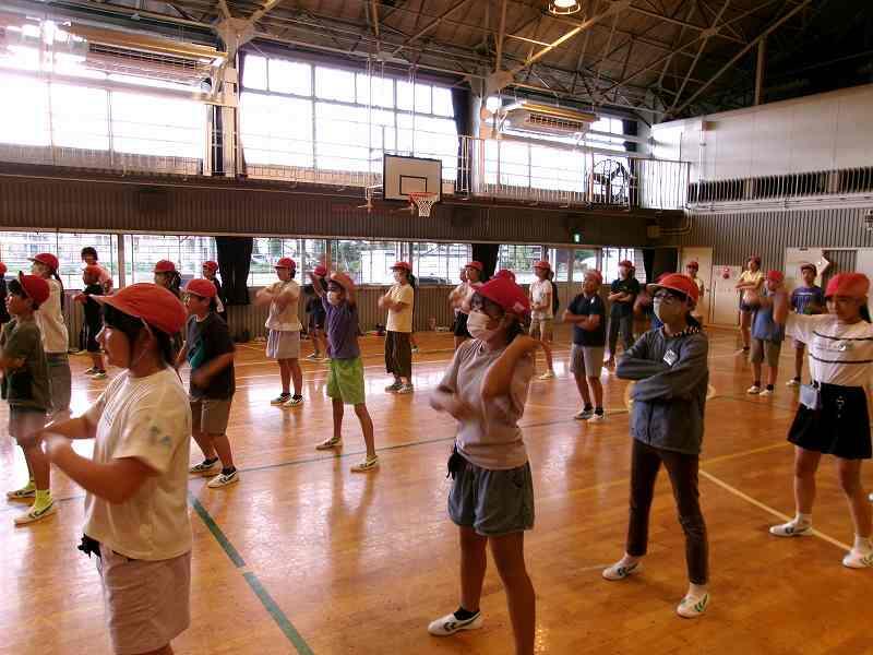 スクリーンに映し出されたお手本を見ながら、子どもたちは真剣に、そして元気いっぱいに練習していました。残暑が厳しい中ですが、体育館に導入されたエアコンのおかげで子どもたちは集中して活動することができました。