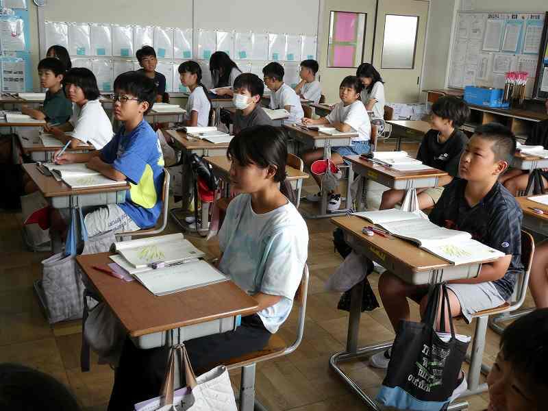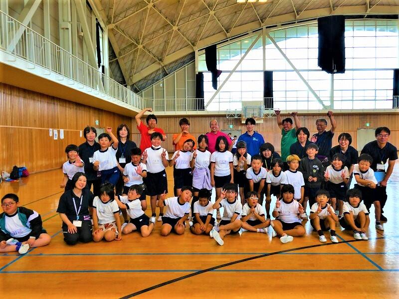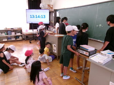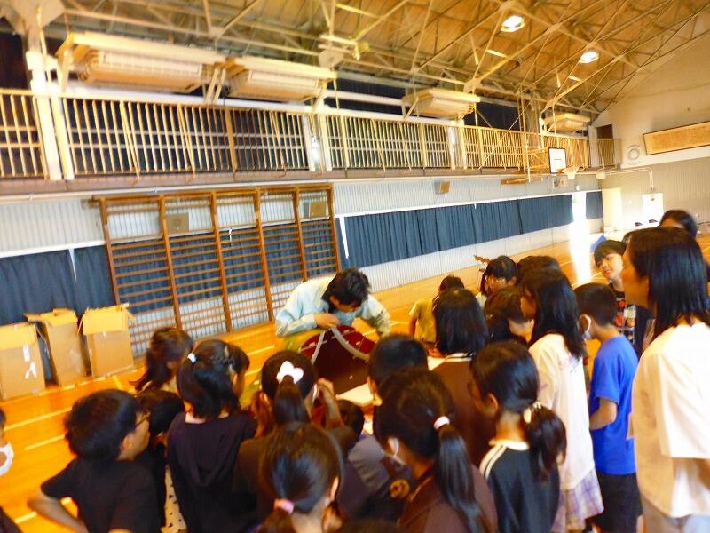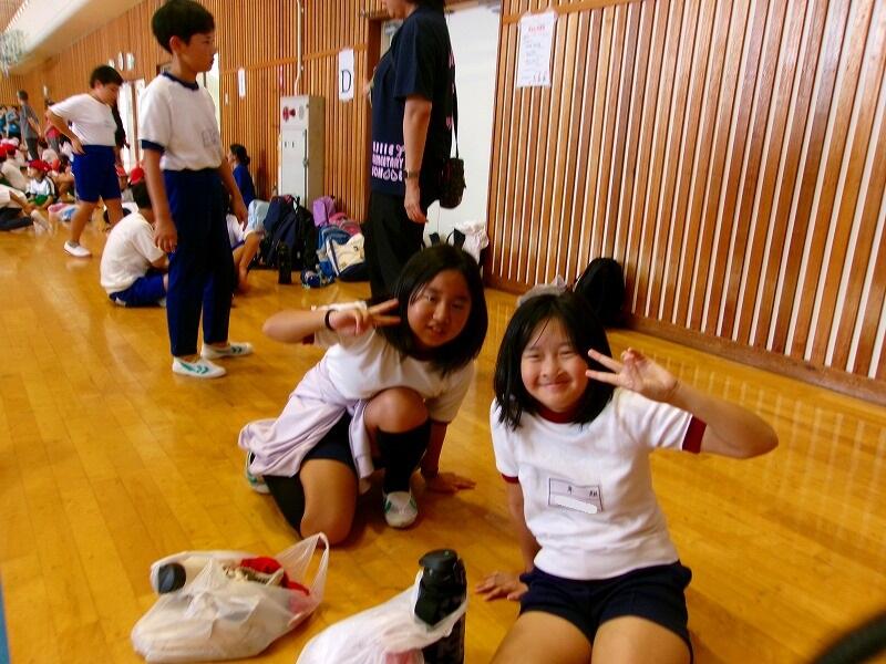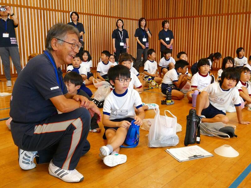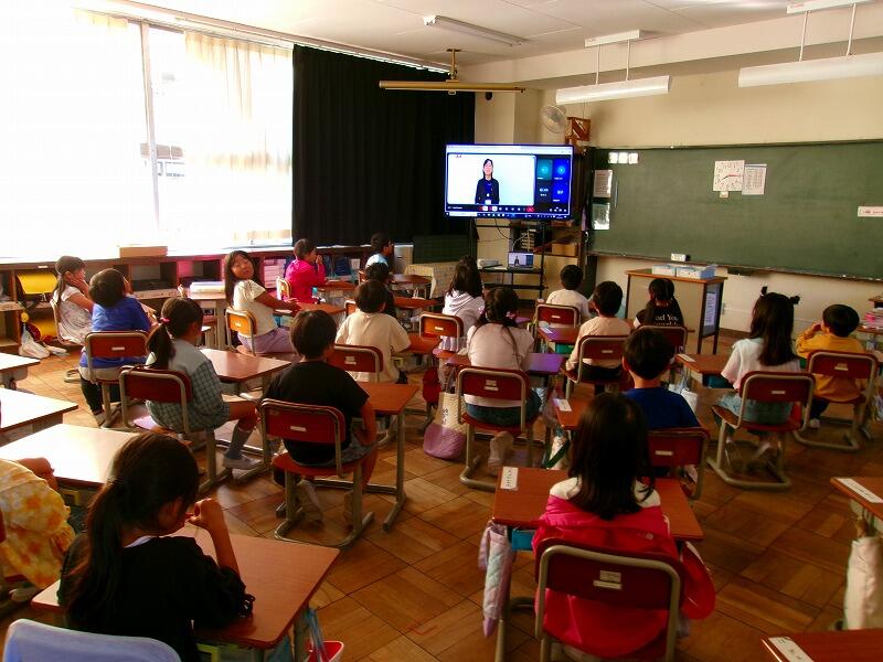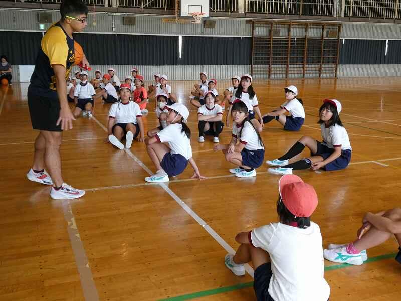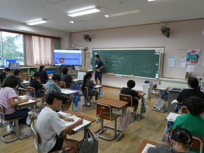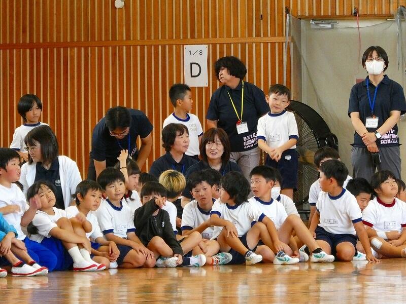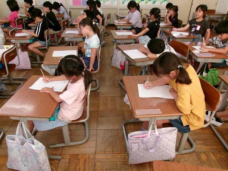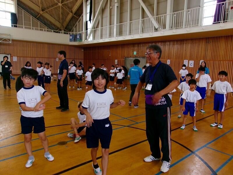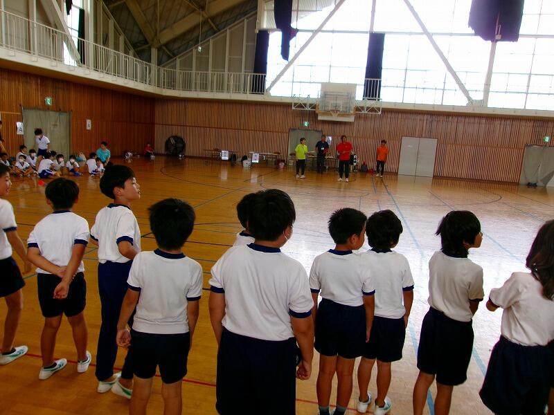 スクリーンに映し出されたお手本を見ながら、子どもたちは真剣に、そして元気いっぱいに練習していました。残暑が厳しい中ですが、体育館に導入されたエアコンのおかげで子どもたちは集中して活動することができました。