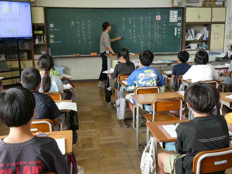 国語の授業の様子です。「詩を味わおう」の学習で、言葉のくり返しや詩の構成について学んでいます。子どもたちは、詩の中の言葉のくり返しに気を付けながら詩の良さを感じ取っていました。