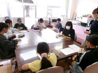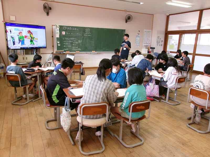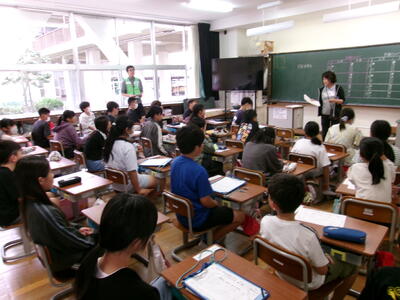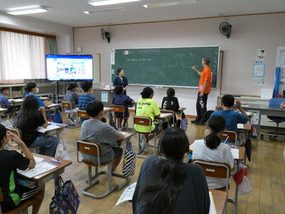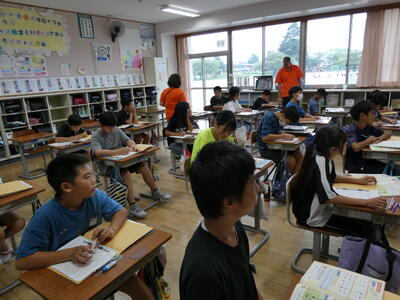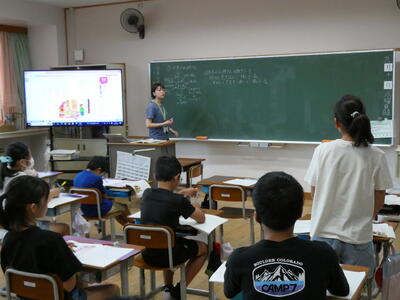 外国語の授業です。英語を使って、夏休みにしたことをたずね合う活動を行いました。