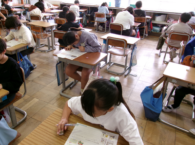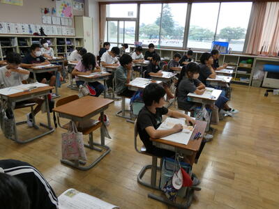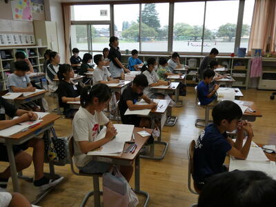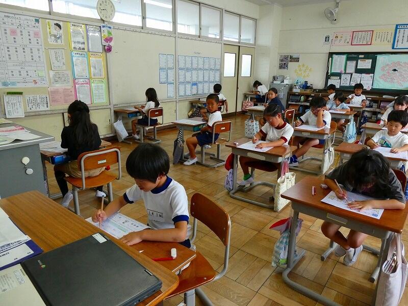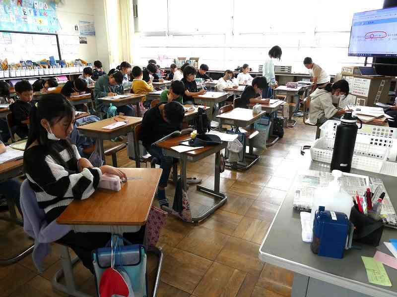 国語の授業です。漢字の復習テストをしています。漢字力の向上は大きな課題です。